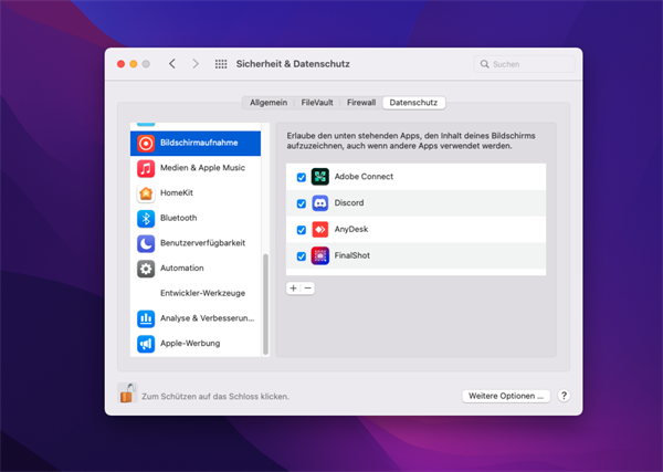 Um auf einem Mac den Bildschirm freigeben bzw. teilen zu können müsst ihr im Menü "Sicherheit und Datschenschutz die "Bildschirmaufnahme" für Adobe Connect erlauben.