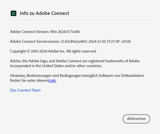 Auf dieser Seite findet ihr immer die aktuellen Versionen zum Download. Sollte eure Adobe Connect-Anwendung älter sein, einfach die entsprechende herunterladen, die vorhandene deinstallieren, den Rechner einmal neu starten und die neue Version installieren.